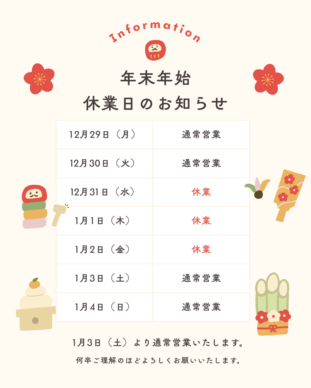 年末は12/30(火)24:00まで営業し、新年は1/3(土)9:00より営業開始いたします。